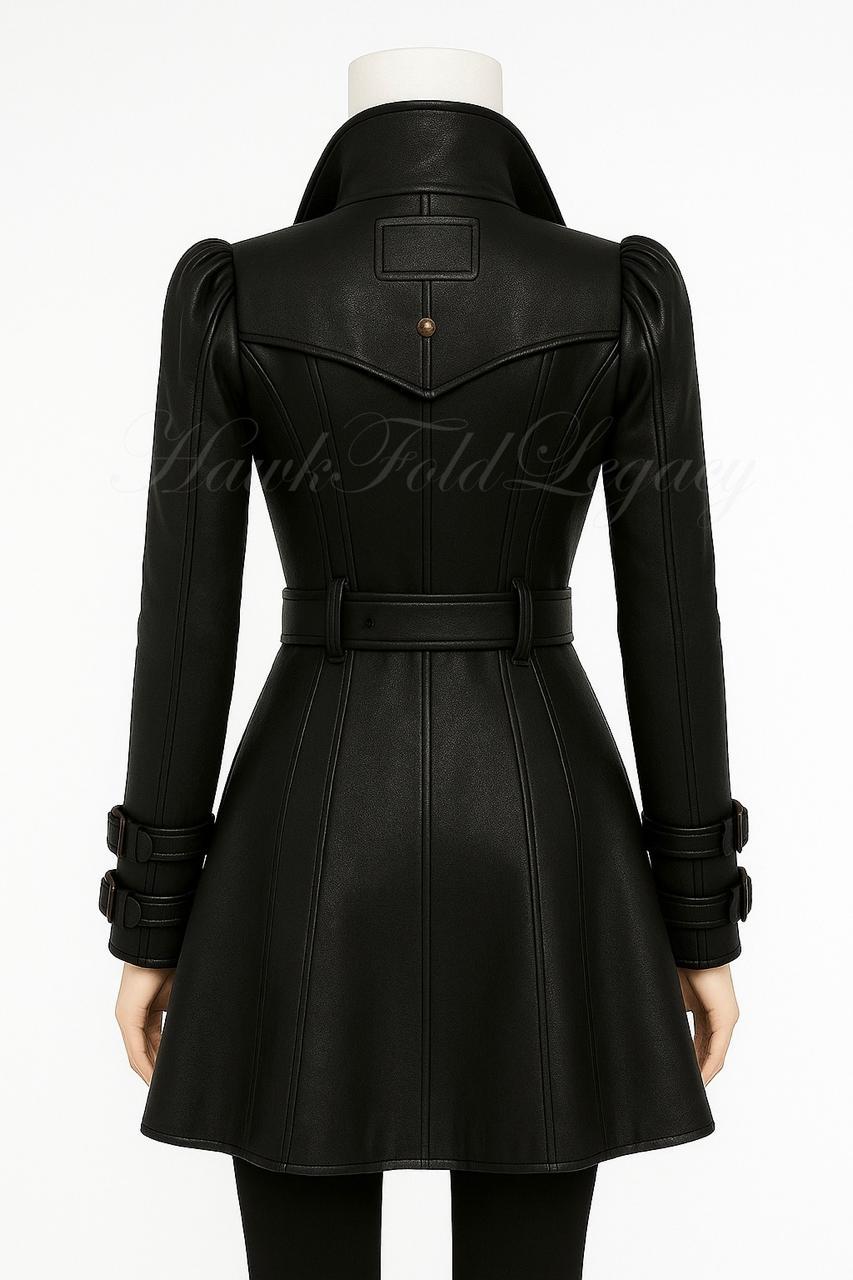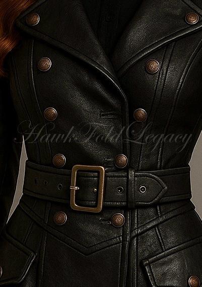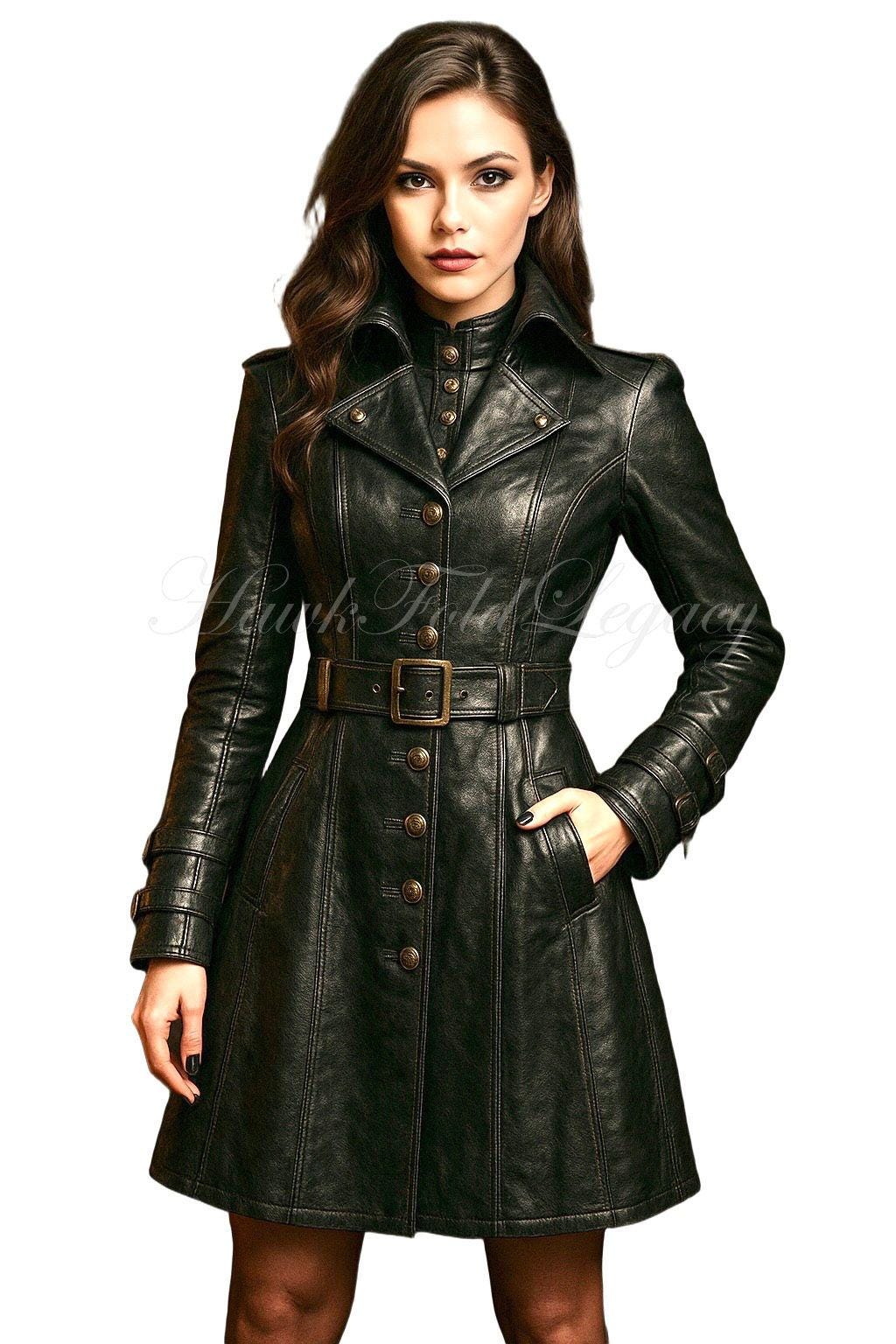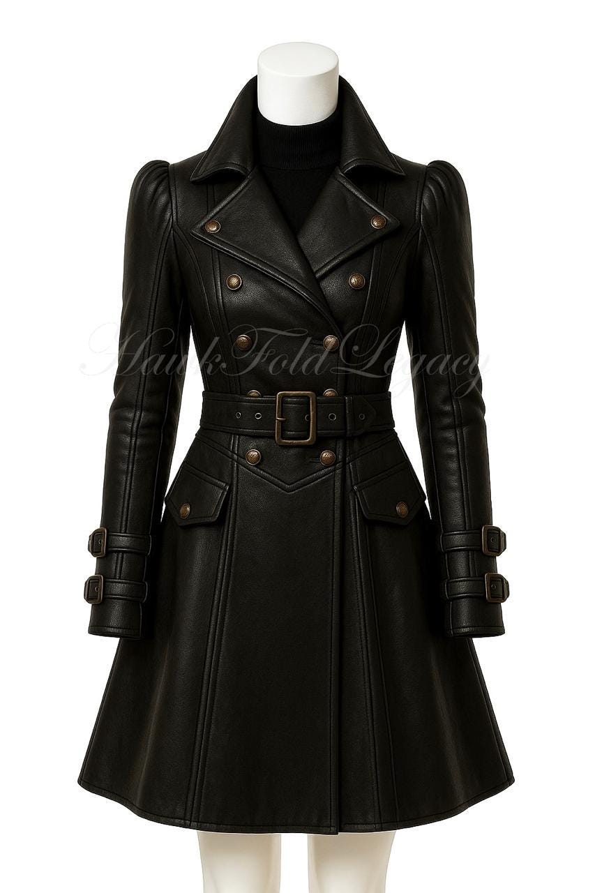 Make a bold statement with this women’s black leather trench overcoat, designed in a timeless double-breasted military style. Crafted with premium sheepskin leather and detailed with a belted waist, brass-style gold buttons, and cuff straps, this coat combines vintage gothic fashion with modern elegance.
