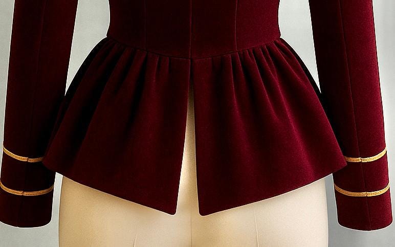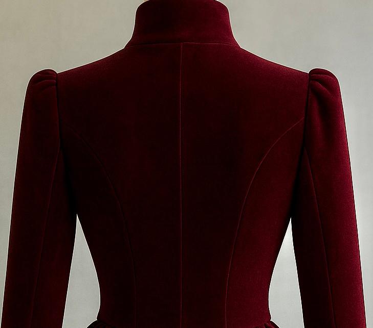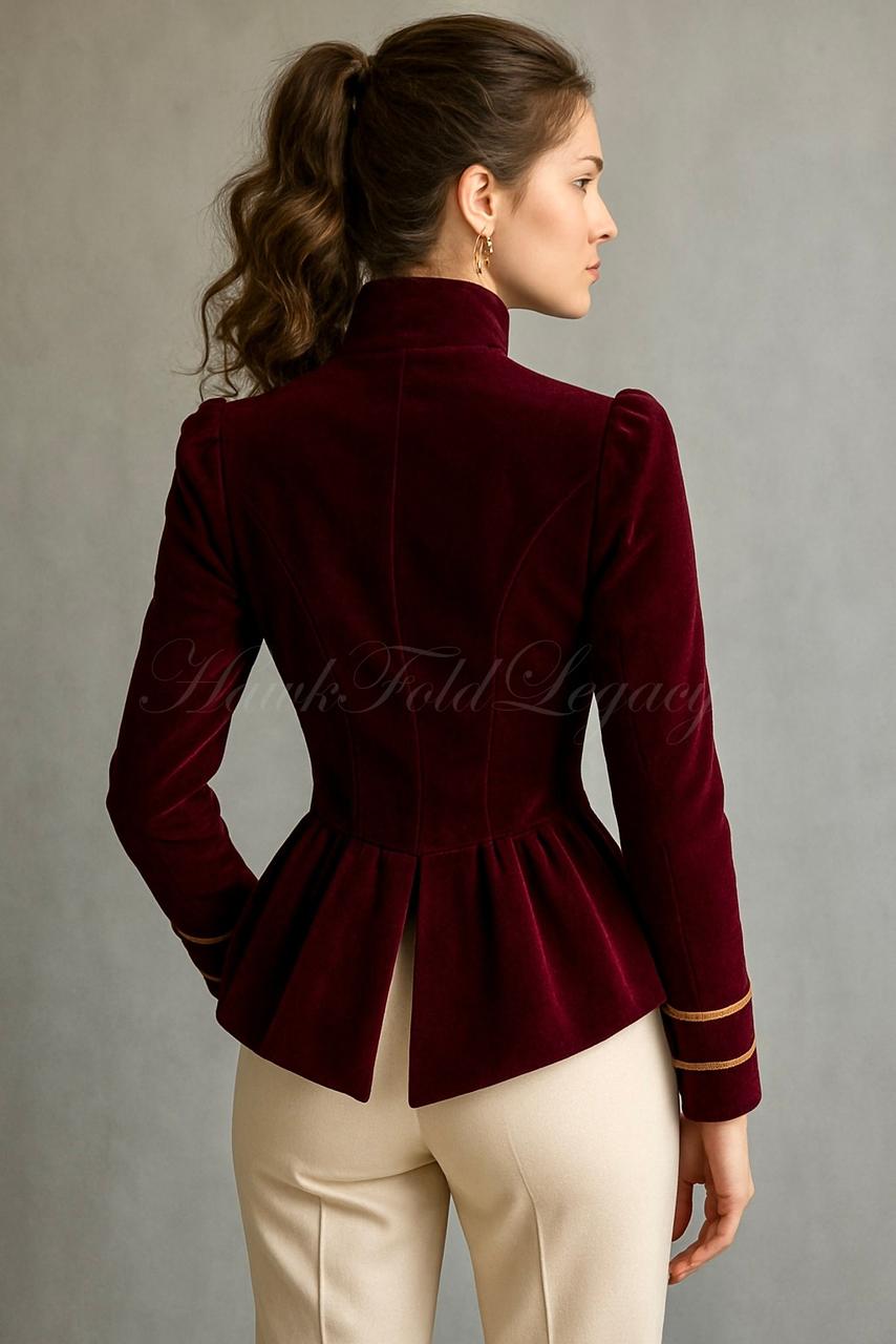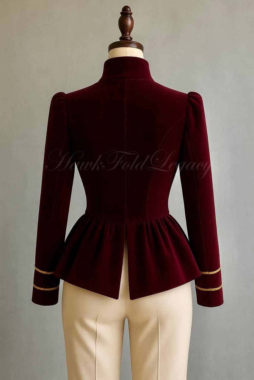 Step into timeless elegance with this Victorian-inspired burgundy velvet jacket, beautifully tailored for a flattering silhouette. Featuring a structured peplum waist, puffed shoulders, and ornate gold buttons, this piece blends historical fashion with modern sophistication.