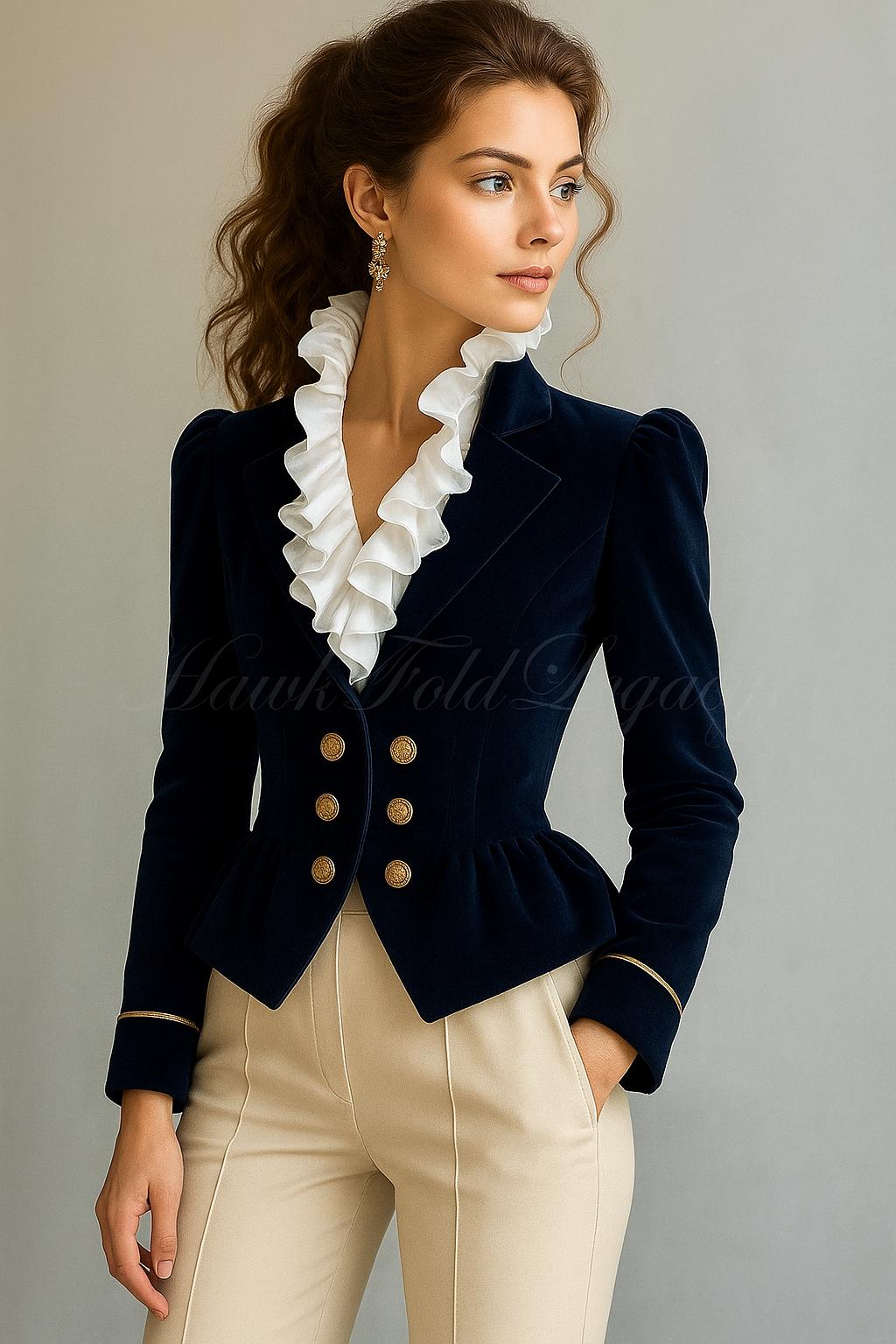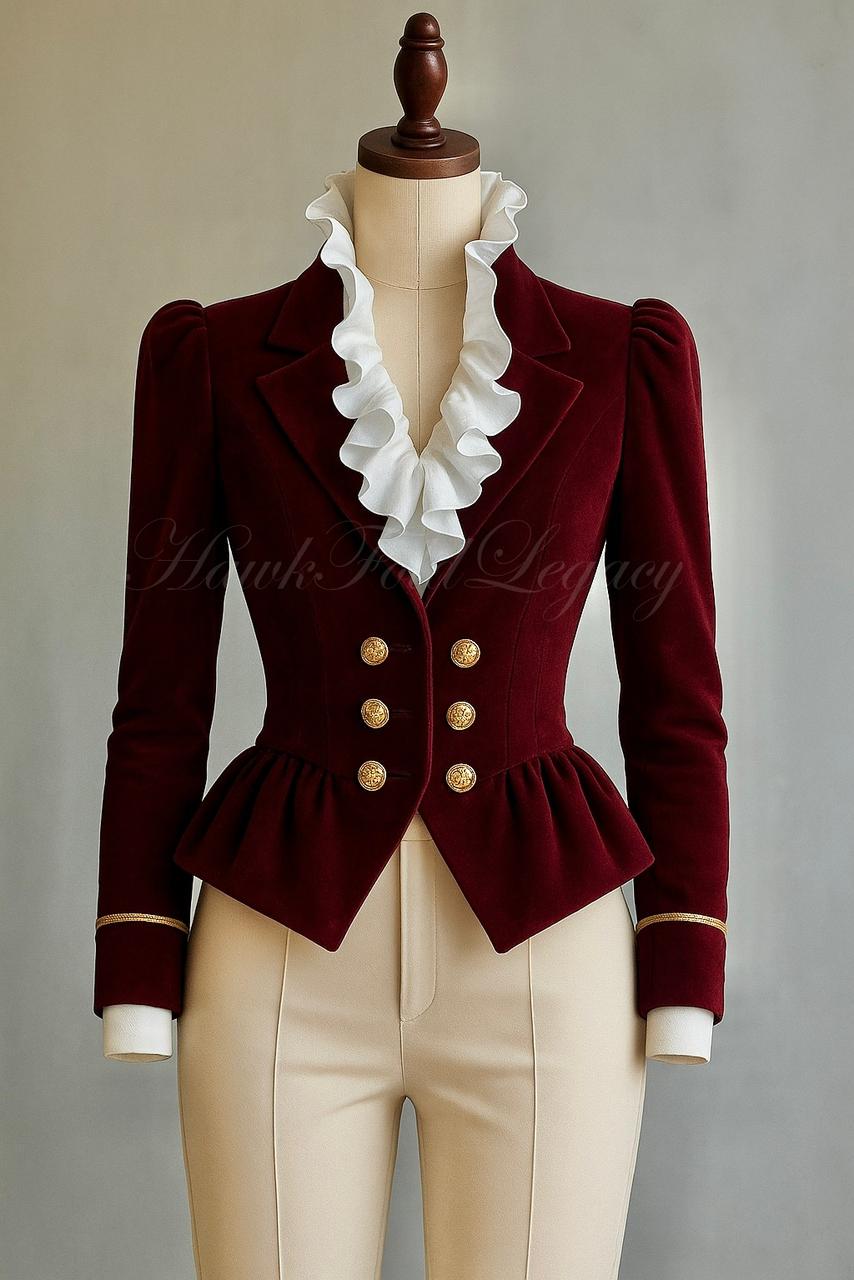 Women’s Victorian Velvet Military Jacket | Burgundy Tailored Blazer with Gold Buttons | Gothic Steampunk Vintage Ruffle Collar Coat | Elegant Fall Fashion