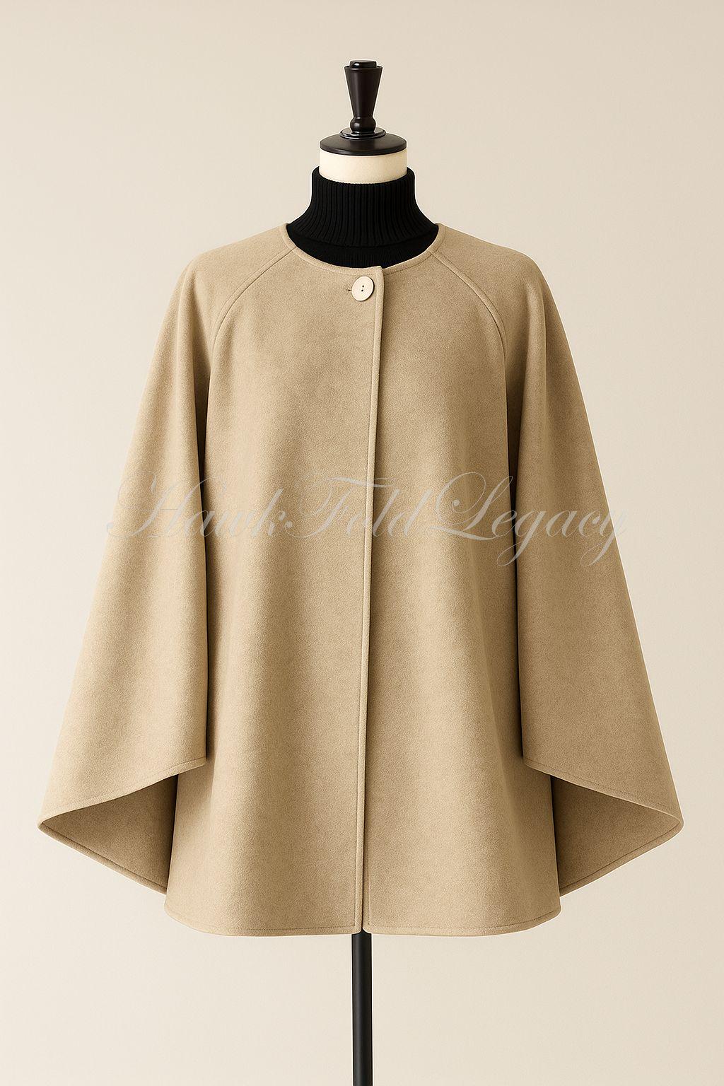 Embrace timeless sophistication with our Women’s Wool Cape Coat, crafted for the modern woman who loves minimalist elegance and vintage-inspired charm. This beautifully tailored beige cloak jacket features a flowing silhouette that drapes effortlessly, adding a touch of refined grace to any outfit.