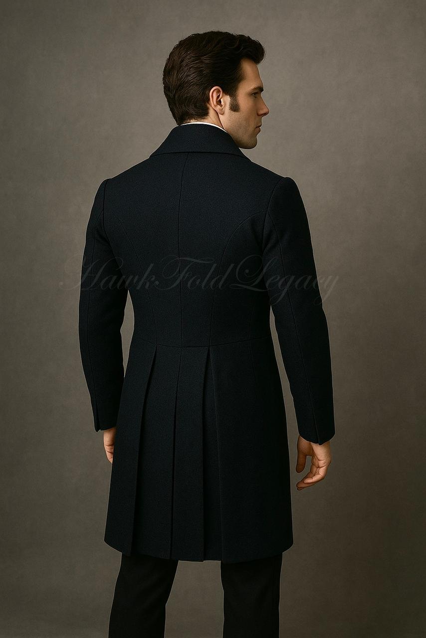 The coat features a sharp cutaway front, double-breasted brass buttons, and a slim tailored fit that highlights the masculine silhouette. The premium wool blend fabric ensures both warmth and comfort, while the silky inner lining adds a touch of luxury.