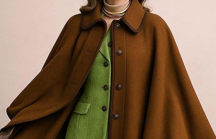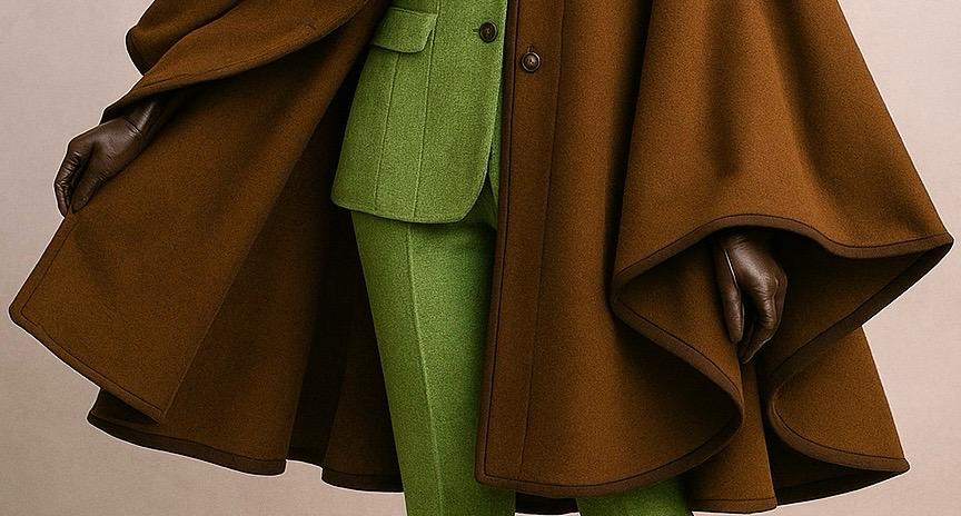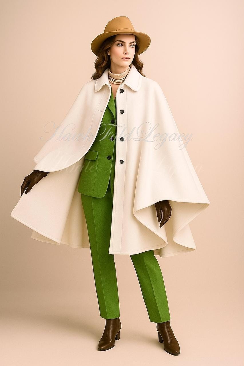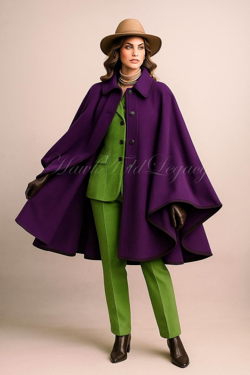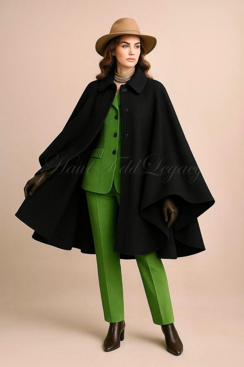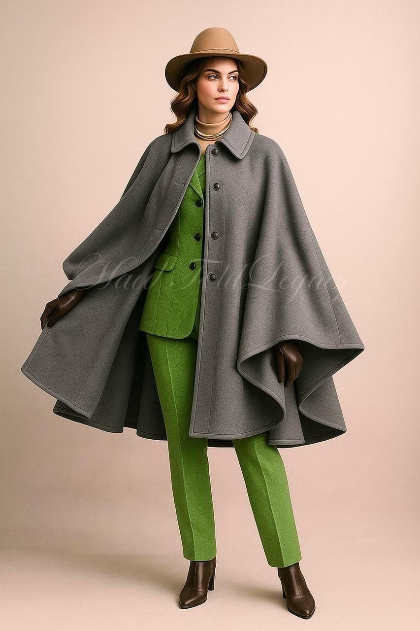 Design Details: Wide flared cape, structured collar, elegant drape, flowing hemline