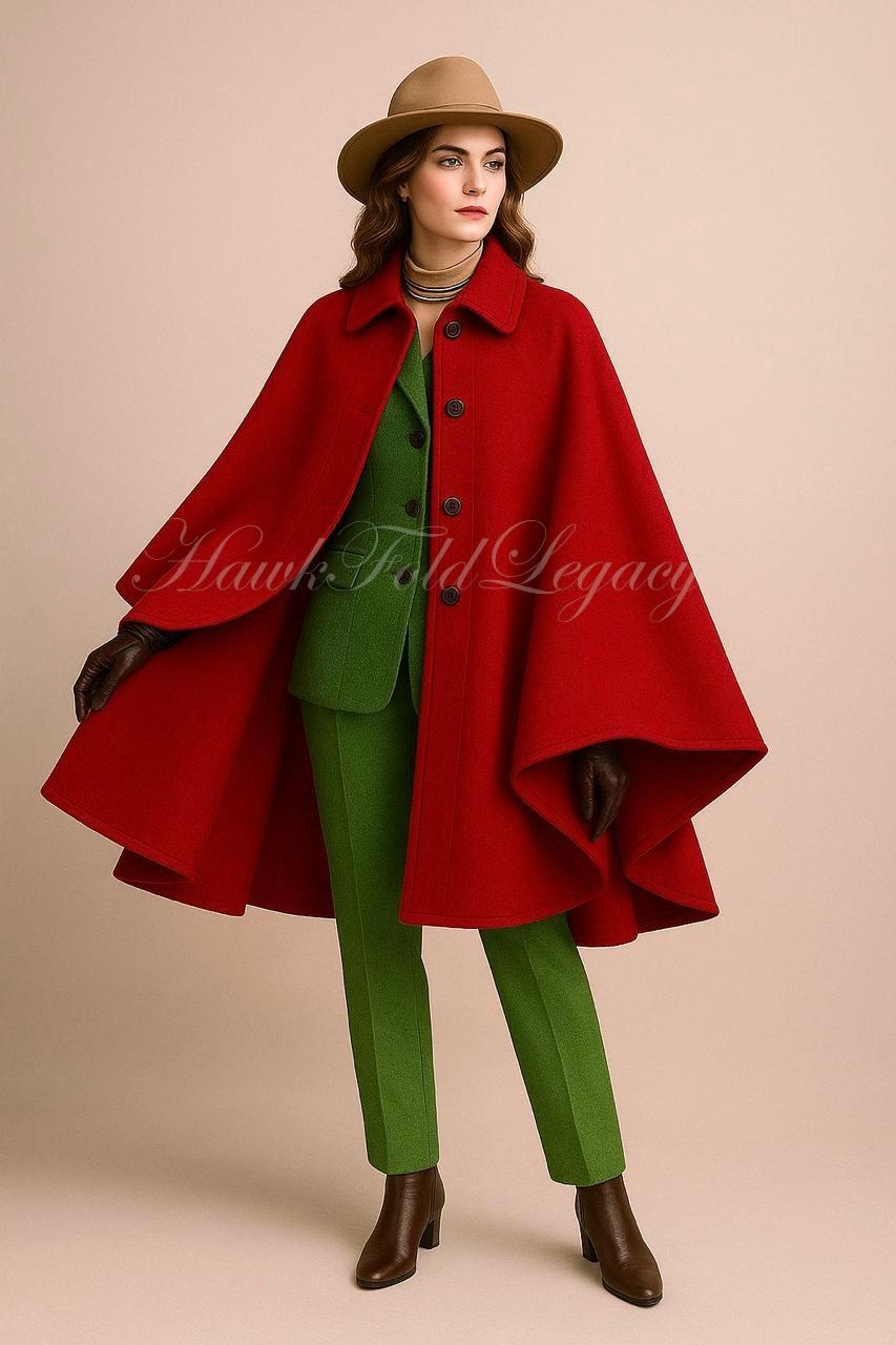 Inspired by Victorian elegance and retro haute couture, this cape coat is ideal for autumn and winter wear. The design features a button-down front, structured collar, and full flared hem that exudes femininity and class. Whether worn for street fashion, photoshoots, cosplay, or formal occasions, this piece adds drama and elegance to any outfit.