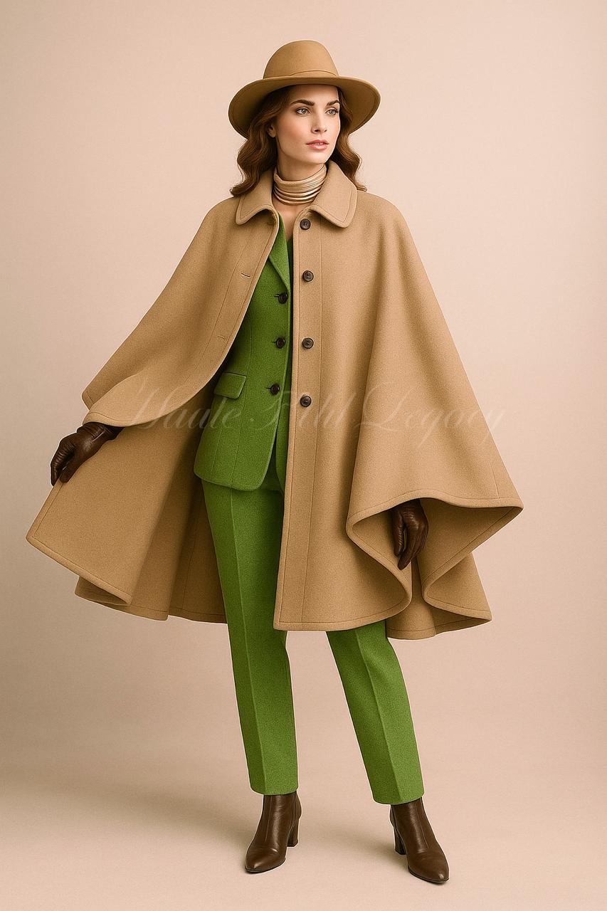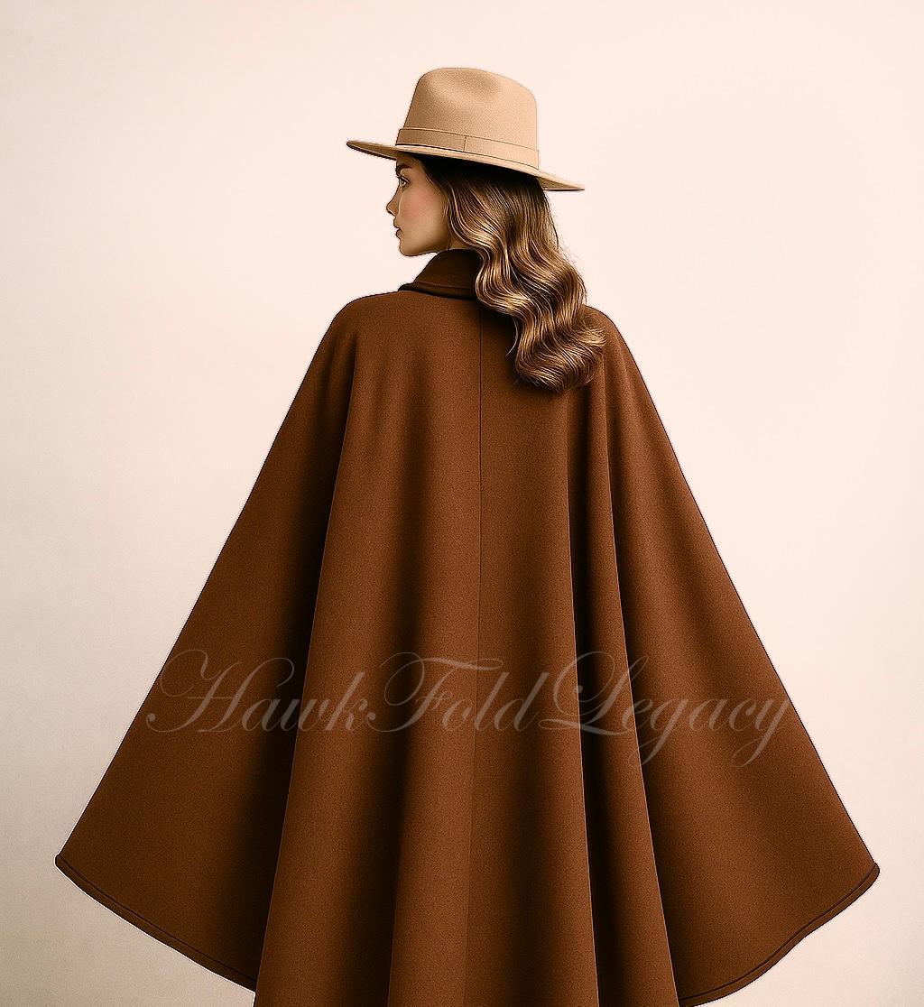 Wrap yourself in timeless elegance with this Women’s Brown Wool Cape Coat, a perfect blend of vintage sophistication and modern chic. Crafted from premium wool-blend fabric, this luxurious brown cloak coat drapes beautifully over the shoulders, creating a graceful and flowing silhouette.