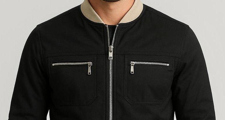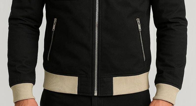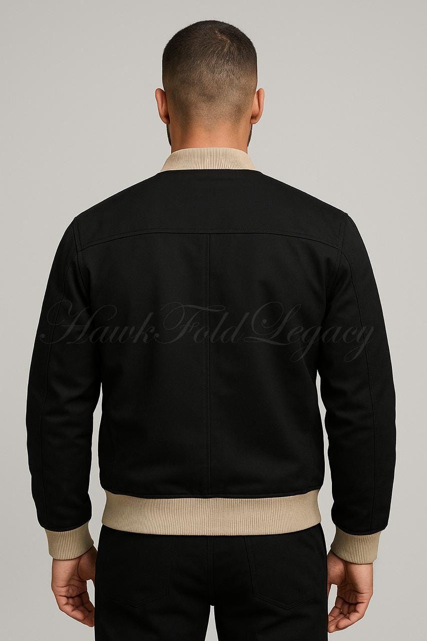 Men’s Black Bomber Jacket | Casual Cotton Zip-Up Jacket with Beige Rib Trim | Slim Fit Streetwear Jacket | Lightweight Spring & Fall Outerwear | Gift for Him